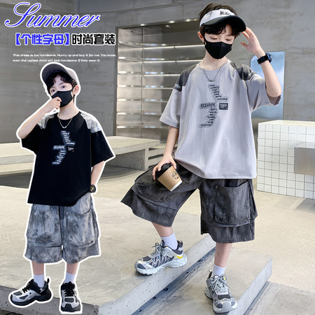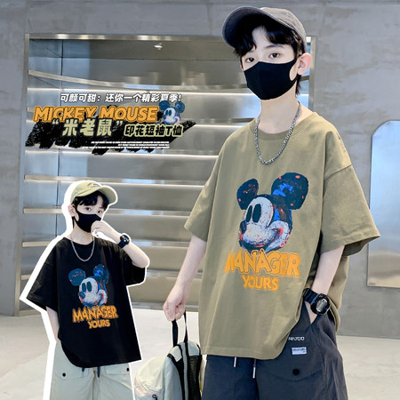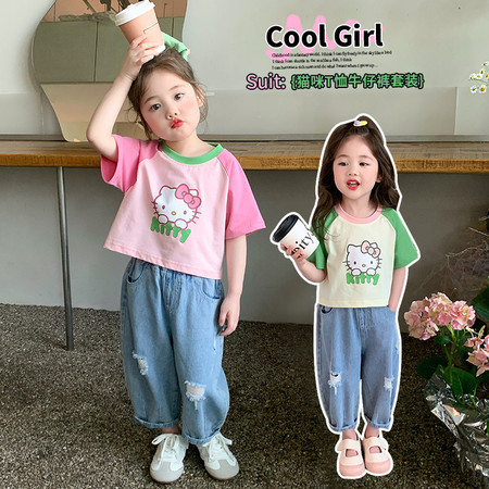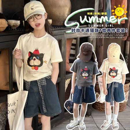 米咔精灵&2535帽子数码印花T恤五分牛仔裤套装