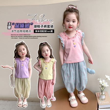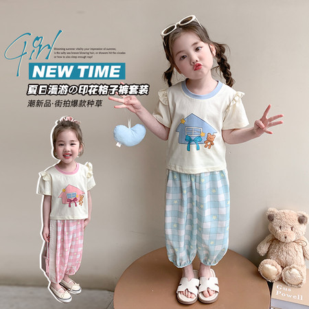 米咔精灵&66068格子蕾丝花边小T花边裤子套装